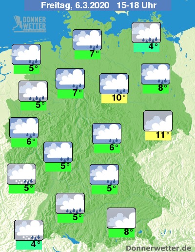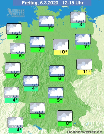 Am frühen Nachmittag fällt zeit- und gebietsweise Regen oder es gehen Schauer nieder. In höheren Lagen können sich auch Schneeflocken oder Graupelkörner unter die Tropfen mischen. Südlich der Donau, sowie im Lee Bereich der Mittelgebirge gibt es längere trockene Abschnitte. Allerdings lockert die Wolkendecke nur selten auf.