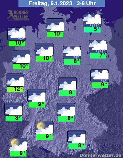 Am Freitag ziehen dichte Wolken durch, dabei bleibt es im Süden trocken, sonst fällt jedoch zeitweise Regen, im Nordosten zum Teil auch Schnee. Die Höchstwerte erreichen 9 Grad im Grabfeld und bis 13 Grad in der Lausitz. Der Wind weht verbreitet stark und teilweise stürmisch.