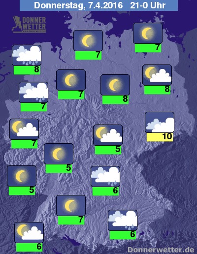 Heute Abend klart der Himmel über großen Landesteilen auf. Im Nordwesten, Südosten und auch im Süden ziehen jedoch verbreitet dichte Wolken durch, die auch zeitweise Regen bringen. Über Sachsen ist es auch meist bedeckt, hier bleibt es jedoch, wie auch im übrigen Bundesgebiet trocken. Die Abendtemperatur liegt bei 10 Grad in Dresden und um 5 Grad am Taunus.