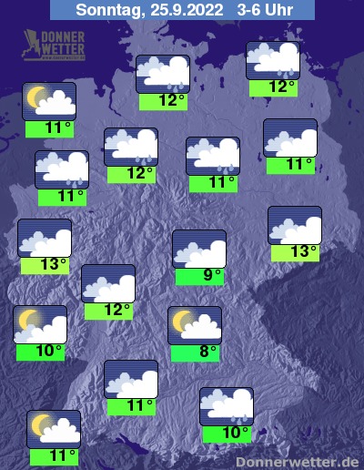 In der kommenden Nacht ist der Himmel zumeist stark, vorübergehend auch mal locker bis aufgelockert bewölkt. Hier und da fällt Regen bei Tiefstwerten von 13 Grad in Köln und etwa 8 Grad in Nürnberg.