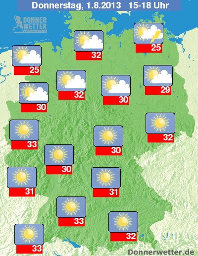 Am Donnerstag setzt sich vor allem in der Südhälfte die Sonne richtig durch. Im Südwesten werden Temperaturen um 33 Grad erreicht!