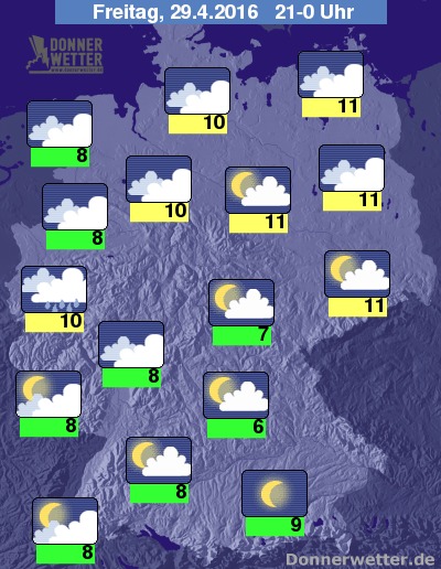 Heute Abend bleibt der Himmel über der Nordwesthälfte des Landes verbreitet stark, und nur hier und da aufgelockert bewölkt, dazu fällt gebietsweise auch Regen. Im Südosten ist es sternenklar und trocken, im übrigen Bundesgebiet ziehen teils lockere, hier und da auch mal dichtere Wolken durch, dabei bleibt es allerdings trocken. Die Abendtemperatur liegt bei 11 Grad in Berlin und um 6 Grad in Mittelfranken.