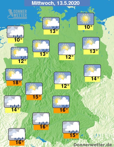 Die Höchsttemperaturen erreichen Werte zwischen kühlen 10 Grad an den Küsten von Nord- und Ostsee, sowie erträglicheren 18 Grad in den Ballungsgebieten des Westens.