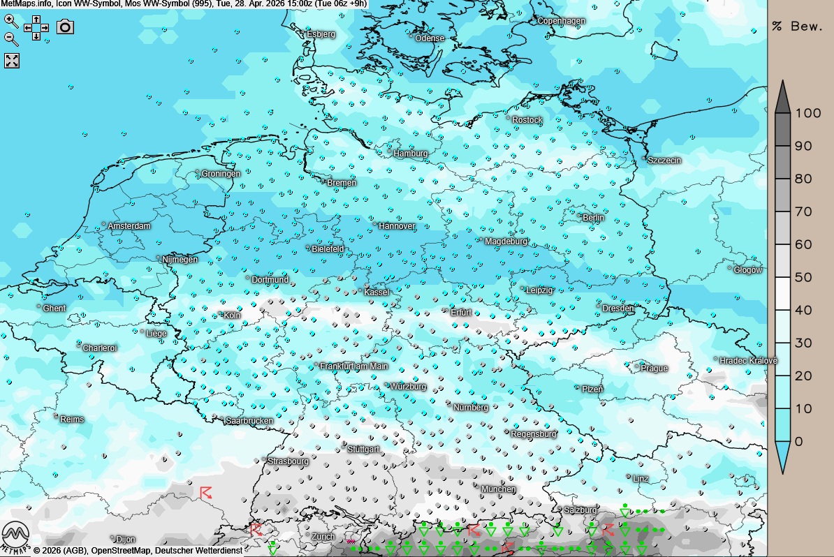 Die Wetter- und Temperaturkarte für 15:00 Uhr nach ICON: