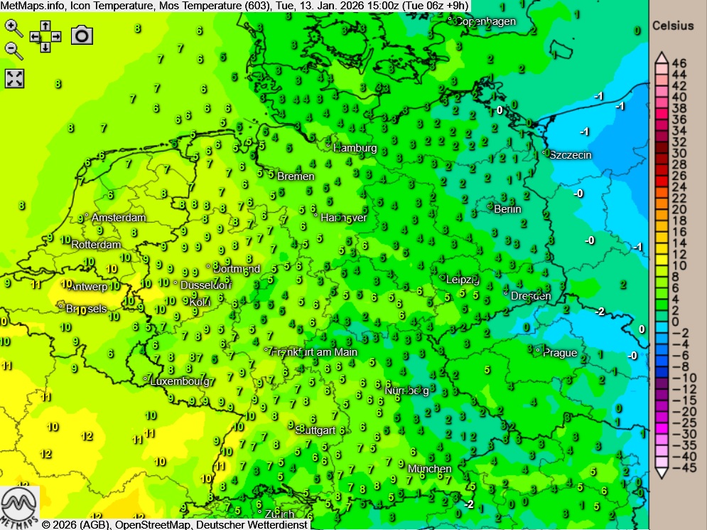 Höchstwerte am Nachmittag um 1 bis 13 Grad.