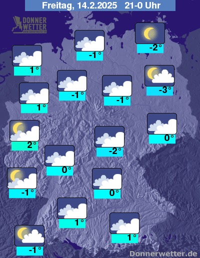 In der Nacht zum Samstag zeigt sich der Himmel über dem Westen und Südwesten sowie über dem Nordosten nur gering bewölkt oder es ist sternenklar. In den übrigen Landesteilen überwiegt starke Bewölkung, es bleibt aber weitgehend niederschlagsfrei.