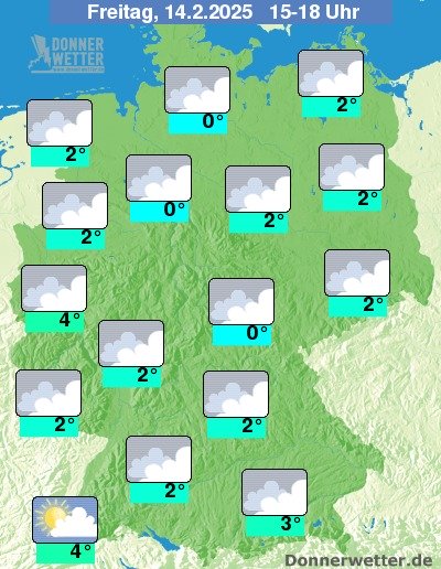 Am Freitagnachmittag zeigt sich der Himmel überwiegend wechselnd oder stark bewölkt; dabei kann vor allem in Alpennähe sowie in den östlichen Mittelgebirgen noch etwas Schnee fallen, sonst bleibt es meist trocken. Im Süden und Südwesten kann sich im Tagesverlauf auch mal längere Zeit die Sonne durchsetzen.