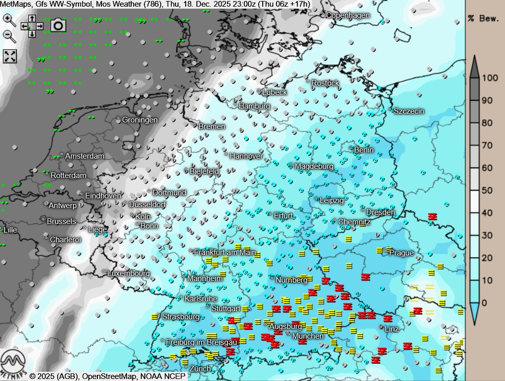 Am Donnerstagnachmittag zeigt sich der Himmel über der Südosthälfte verbreitet heiter, teils kann sich hier aber auch in den Nachmittagsstunden zäher Nebel halten. Über der Nordwesthälfte dominiert in den nächsten Stunden starke Bewölkung, es bleibt aber überwiegend niederschlagsfrei.