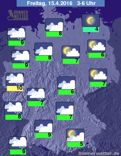 In der folgenden Nacht ist es im Norden und Osten zunächst sternenklar oder locker bewölkt, über der Südwesthälfte ist es schon meist dicht bewölkt und zunächst fällt nur im Südwesten zeitweise Regen. Die Niederschläge breiten sich im Nachtverlauf jedoch nordostwärts aus und erreichen gegen Morgen etwa einen Streifen von Schleswig-Holstein bis zum westlichen Erzgebirge. Im Osten und Nordosten nimmt die Bewölkung zwar zu, hier bleibt es aber noch weitgehend trocken. Die Temperatur sinkt auf 10 Grad in Aachen und bis 4 Grad in Vorpommern.