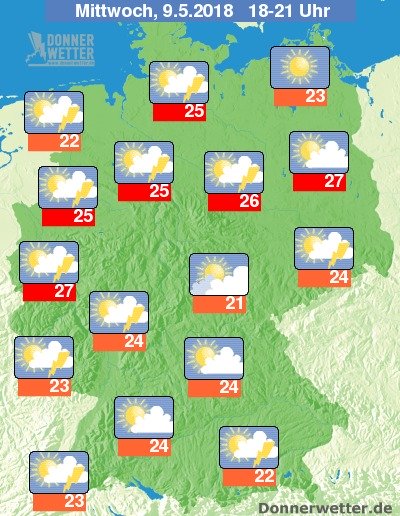 Am Donnerstag zeigen sich im Osten und Nordosten häufig Aufheiterungen, im übrigen Bundesgebiet ist es zum Teil aufgelockert, teils ist es stark bewölkt, dabei bilden sich zeitweise Schauer, auch Gewitter sind möglich. Die Temperatur steigt nur noch auf 13 Grad am Pfälzer Wald und bis 26 Grad in der Lausitz.