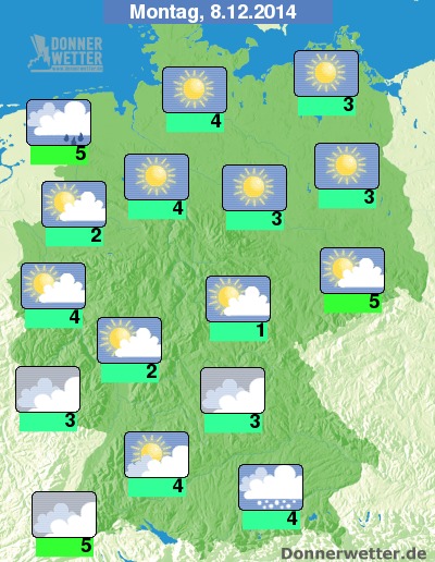Am Montag fällt besonders am Alpenrand und gebietsweise im übrigen Süddeutschland noch zeitweise Schnee, Schneeregen oder Regen, sonst ist es häufig aufgelockert bewölkt, vor allem von der Mitte bis nach Norddeutschland auch häufig heiter bis sonnig, teils hält sich hier aber auch hochnebelartige Bewölkung. Dabei bleibt es zunächst trocken, jedoch zieht zum Abend hin im Westen und Nordwesten dichte Bewölkung mit Regen, Schneeregen und Schnee auf. Dabei kann es teils glatt auf den Straßen werden. Die Temperatur steigt auf 1 Grad im Vogtland und bis 5 Grad in Freiburg.
