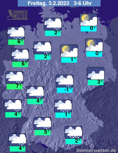 In der kommenden Nacht zieht zunächst im Westen und Südwesten kompakte Bewölkung und Regen, teils Schneeregen auf, der sich im Laufe der Nacht weiter nach Osten hin ausbreitet. Über Bayern und Thüringen fallen die Niederschläge zum teils auch als Schnee. Gegen Morgen ist es dann lediglich im Osten und Nordosten noch weitgehend trocken. Die Temperatur sinkt auf 7 Grad in Köln und -1 Grad in Jena.
