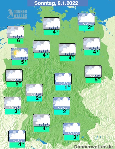 Am Sonntag ziehen überwiegend dichte Wolken durch, nur vereinzelt sind Auflockerungen möglich. Es fällt vielerorts Schnee, Schneeregen oder Regen. Die Temperatur erreicht 1 Grad im Thüringer Becken und bis 6 Grad an der Nordsee. An den Küsten ist es zudem verbreitet stürmisch.