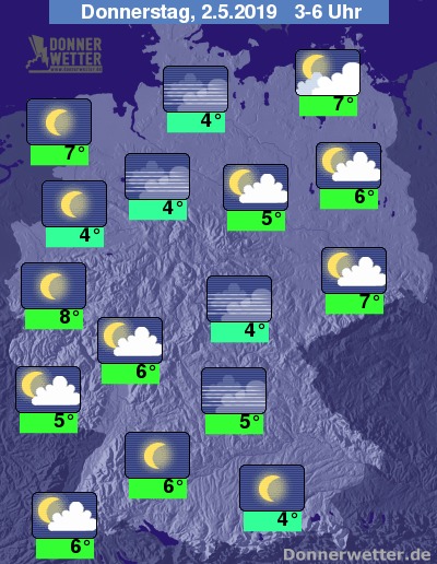 In der kommenden Nacht sind meist keine Niederschläge zu erwarten. Es klart im Westen und Süden auf. Um Hamburg, Thüringen, Bremen und Oberfranken bildet ich Nebel. Sonst ist es meist locker bewölkt. Die Temperaturen fallen auf 4 bis 7 Grad.