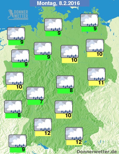 Am Rosenmontag ist es im Süden und Osten anfangs noch teils aufgelockert bewölkt und meist noch trocken, im großen Rest des Landes ziehen aber bereits weitgehend dichte Wolken übers Land und es fällt immer wieder, teils kräftiger und auch langanhaltender Regen. Am Nachmittag sind im Norden und Westen auch vereinzelte, kurze Gewitter nicht auszuschließen. Dazu weht ein verbreitet starker bis stürmischer Wind, dabei sind auch im Flachland schwere Sturmböen möglich. In höheren Lagen und an der See herrscht oft Sturm mit teils orkanartigen Böen. Die Temperatur steigt auf 7 Grad im Westerwald und bis 12 Grad in Stuttgart.