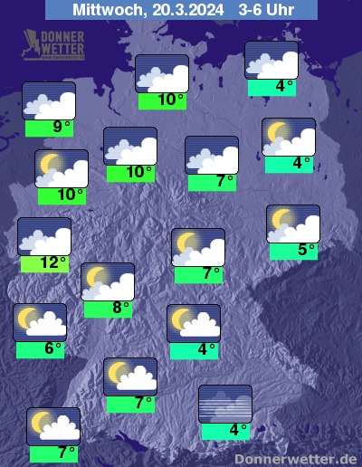 In der Nacht auf Mittwoch ist der Himmel über der Südhälfte und der Mitte meist locker bewölkt, teils auch sternenklar. Gebietsweise kann sich in den frühen Morgenstunden Nebel bilden. In den übrigen Landesteilen überwiegt starke Bewölkung, es bleibt aber meist niederschlagsfrei.
