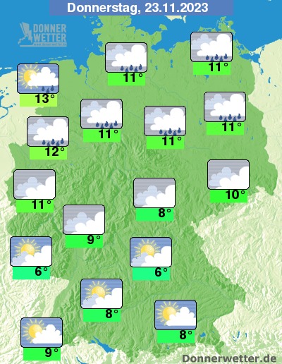 Am Donnerstag zeigt sich der Himmel überwiegend stark bewölkt oder es ist bedeckt, südlich der Donau ist es nach Nebelauflösung häufig heiter oder sonnig. In der Nordhälfte muss am Donnerstag mit Regen oder Sprühregen gerechnet werden, am Nachmittag intensiviert sich dieser; sonst bleibt es meist niederschlagsfrei.