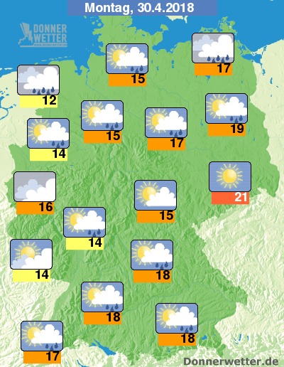 Heute zeigt sich das Wetter phasenweise heiter bis sonnig, zeitweise ziehen aber auch dichte Wolken durch, dabei sind sowohl Schauer als auch einzelne Gewitter möglich. Die Temperatur erreicht 12 Grad in Emden und bis 21 Grad in der Lausitz.