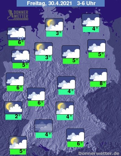 In der Nacht zum Freitag lockert und klart der Himmel über dem Süden verbreitet auf. Weiter nach Norden hin ist es dagegen oft stark und hier und da aufgelockert bewölkt, dazu fällt im Nordwesten und auch in Ostseenähe gebietsweise Regen, sonst bleibt es weitgehend trocken. Die Temperatur sinkt auf 8 Grad in Dresden und bis 2 Grad in Saarbrücken.