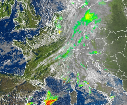 Regengebiete sind über Deutschland heute Abend auf unserem Spezialsatellitenbild farblich deutlich markiert zu sehen. Weitere Satellitenbilder finden Sie hier.