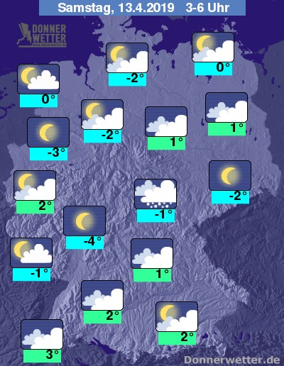 Die Temperaturen sinken auf Tiefstwerte um 3 Grad C im Breisgau und um -3 Grad C im Münsterland.