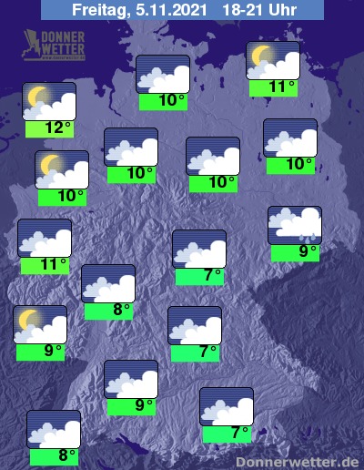 Heute Abend lockert die Bewölkung im Norden gebietsweise auf, sonst bleibt es aber überwiegend dicht bewölkt oder trüb. An der Küsten bilden sich einzelne Schauer, sonst bleibt es weitgehend trocken. Die Temperatur liegt bei 7 Grad in Nürnberg und um 12 Grad in Cuxhaven.