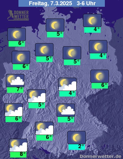 In der Nacht zum Freitag zeigt sich der Himmel südlich des Mains gering oder wechselnd bewölkt, sonst ist es zumeist sternenklar. Es bleibt trocken.