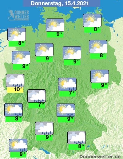 Am Donnerstag ist es wechselnd bis stark bewölkt, dabei bleibt es im Norden und Osten weitgehend trocken, im übrigen Bundesgebiet bilden sich jedoch gebietsweise Schnee- oder Regenschauer. Die Temperatur steigt auf 7 Grad im Thüringer Becken und bis etwa 10 Grad im Rheinland.