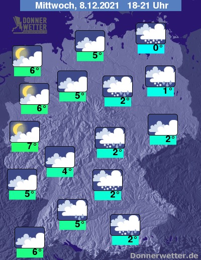 Am späten Abend und in der ersten Nachthälfte zeigt sich der Himmel über dem Nordwesten anfangs noch aufgelockert bewölkt, sonst ist es über weiten Landesteilen bedeckt. Im Süden und Osten muss dabei immer wieder mit Schneeregen oder Schnee gerechnet werden, in der Westhälfte bleibt es dagegen überwiegend trocken.