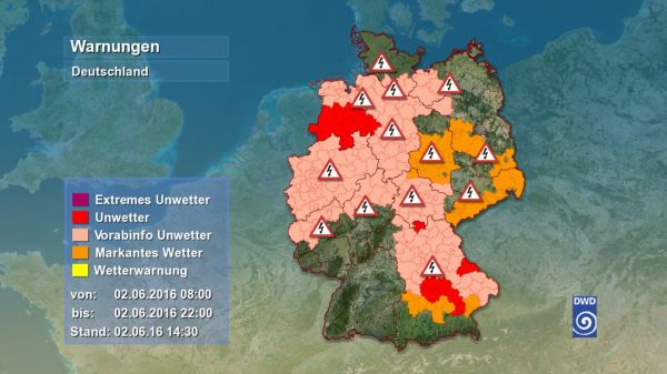 Etwas ruhiger oder mit einer geringerer Gewittergefahr kommt der Südwesten, der Alpenrand sowie weite Teile Ost- und Nordostdeutschlands davon.