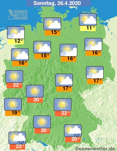 Am Sonntag ist es überwiegend sonnig, hier und da ziehen lockere Wolken durch. Im Norden und an den Alpen ist es jedoch oft auch stark bewölkt. Am Alpenrand sind dabei Schauer und Gewitter möglich, sonst bleibt es trocken. Die Temperatur steigt auf 11 Grad in Stralsund und bis 22 Grad in Nürnberg.