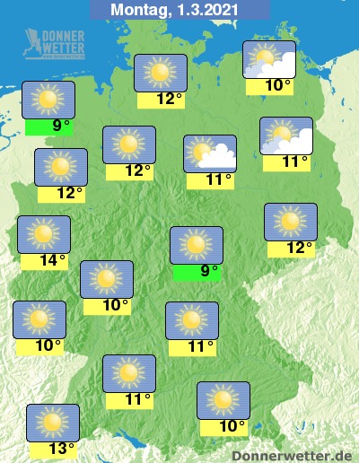 Am Montag scheint über der Bundesrepublik verbreitet die Sonne, lediglich im östlichen Brandenburg und Vorpommern sind mal einige Wolken möglich, dabei bleibt es trocken. Die Temperatur steigt auf 9 Grad an der Nordsee und bis 14 Grad in Köln.