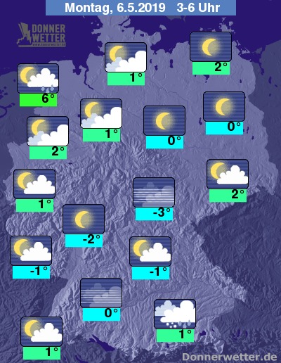 In der folgenden Nacht klingen letzte Schauer meist rasch ab, lediglich am Alpenrand fällt bei dichten Wolken bis weit in die Nacht hinein Schnee oder Schneeregen. Gegen Morgen kommen im Nordwesten dichte Wolken mit Schauern auf. Im übrigen Bundesgebiet bleibt es bei locker bewölktem oder klarem Himmel weitgehend trocken. Die Temperatur sinkt auf 6 Grad in Bremerhaven und bis -3 Grad im Eichsfeld.