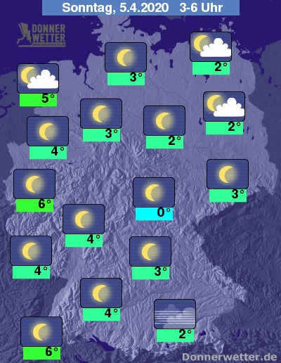 In der folgenden Nacht ist der Himmel verbreitet sternenklar, vor allem an den Küsten, aber auch im übrigen Norden können einige, meist aufgelockerte Wolken durchziehen, dazu bleibt es trocken. Die Temperatur sinkt auf 6 Grad am Rhein und bis 0 Grad im Vogtland.