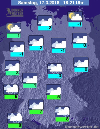 Heute Abend halten sich mit Ausnahme der küstennahen Gebiete verbreitet dichte Wolken, die über der Südhälfte hier und da noch etwas Regen, Schneeregen oder Schnee bringen, sonst bleibt es aber weitgehend trocken. Die Temperatur liegt bei -3 Grad im Vogtland und bis 8 Grad im Oberrheingraben.