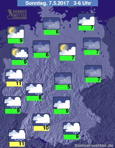 In der Nacht zum Sonntag fällt unter dichten Wolken über dem Süden und Westen Deutschlands zeitweise Regen. Dichte Wolken halten sich auch über Vorpommern, wobei die nur selten Regen bringen. Im großes Rest des Landes ist der Himmel verbreitet nur locker bewölkt oder sternenklar und dazu trocken. Die Temperatur sinkt auf 11 Grad im Breisgau und bis 5 Grad im Thüringer Becken.