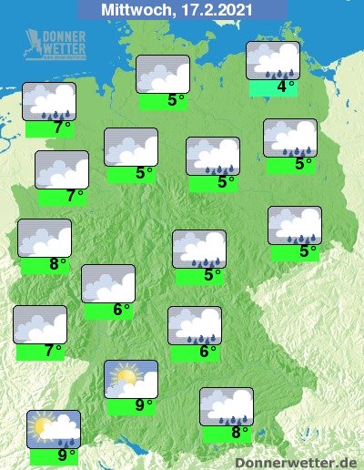 Am Mittwoch ist es häufig stark, hier und da und besonders im Süden aber auch locker bis aufgelockert bewölkt. Im Osten ist zudem anfangs noch etwas Regen möglich, sonst bleibt es aber größtenteils trocken. Die Temperatur steigt auf 4 Grad in Stralsund und bis 9 Grad in Stuttgart.