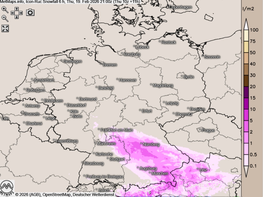 Am Donnerstagnachmittag bleibt es im Norden und Osten Deutschlands bei wechselnder Bewölkung weitgehend trocken. Von den Alpen breiten sich im Nachmittag teils kräftige Niederschläge aus, die bis in tiefe Lagen auch in Schnee übergehen können. Auch am Abend ist vor allem in Alpennähe noch kräftiger Schneefall möglich.