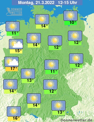 Heute Nachmittag scheint die Sonne über dem Land von einem größtenteils stahlblauen Himmel. Ein paar lockere Wolkenfelder sind entlang des Rheins möglich. Es bleibt überall trocken bei 10 Grad an der Ostsee und etwa 17 Grad im Rheinland.