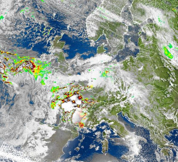 Das Satellitenfoto von heute Morgen zeigt besonders über Frankreich, aber auch über der Südwesthälfte von Großbritannien, sehr kompakte Wolken, die für zahlreiche Schauer und auch teils kräftige Gewitter sorgten. Auch über Deutschland lagen am Morgen oft dichte Wolken, dabei bildeten sich gebietsweise auch Schauer.