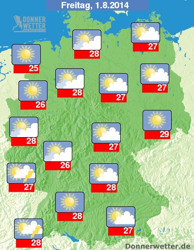 Am Freitag können wir uns erneut auf einen herrlichen Sommertag mit reichlich Sonnenschein und meist nur harmlosen Wolken freuen. Gebietsweise mehr Quellwolken ziehen im Südwesten auf, hier sind auch lokale Schauer und Gewitter möglich, sonst sollte es jedoch trocken bleiben. Die Temperatur steigt auf durchweg sommerliche Werte zwischen 25 Grad in Ostfriesland und um 28 Grad am Oberrhein.