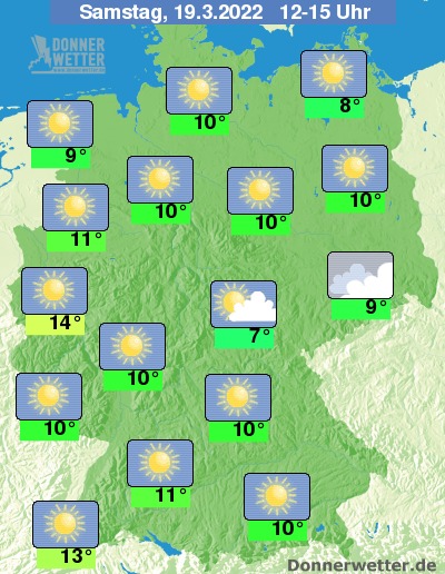Heute Nachmittag scheint über dem Land verbreitet die Sonne. Lediglich im Osten halten sich gebietsweise einige und zum Teil auch dichte Wolken. Es bleibt landesweit trocken bei Werten von 7 Grad im Vogtland und bis 14 Grad im Rheinland.