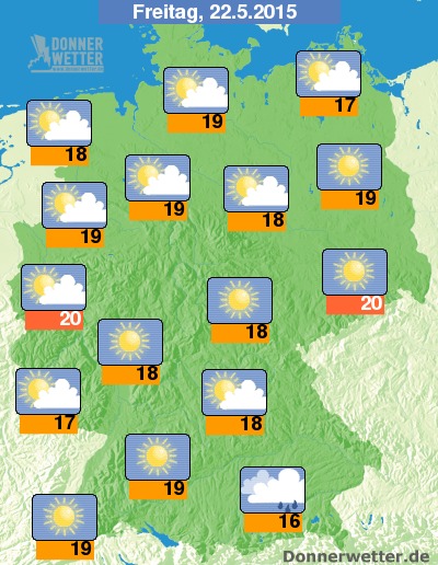 Heute halten sich im Südosten des Landes dichte Wolken, die für zeitweilige Regenfälle sorgen. Im übrigen Land wechseln sich Sonne und Wolken einander ab und es bleibt trocken. Besonders freundlich mit viel Sonnenschein wird es in einem breiten Streifen vom Oberrheingraben bis nach Sachsen und Brandenburg hinein. Die Temperatur steigt auf kühle 16 Grad im Alpenvorland und bis auf 20 Grad am Niederrhein.
