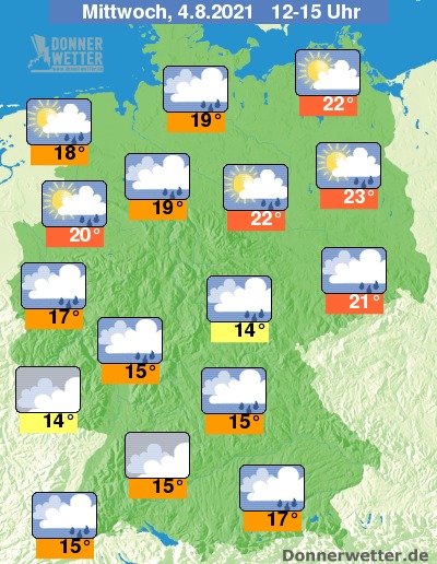Heute Abend ist es im Norden gebietsweise locker bis aufgelockert, sonst jedoch verbreitet dicht bewölkt. Es bilden sich wiederholt Schauer und örtlich sind auch Gewitter möglich. Die Temperatur liegt bei 16 Grad in Mittelfranken und bis 23 Grad an der Müritz.