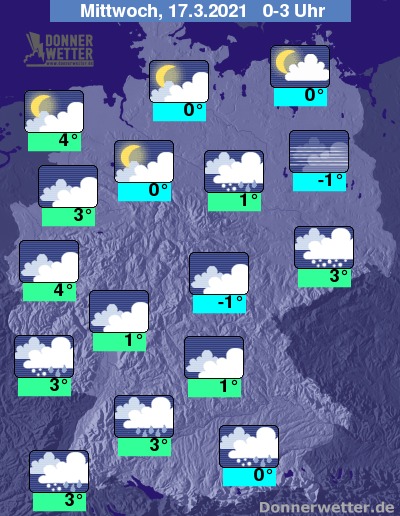 In der Nacht auf Mittwoch lockern die Wolken im Norden und später auch über Teilen der Mitte weiter auf, Schauer sind dabei nur vereinzelt zu erwarten. In der Südhälfte Deutschlands überwiegt starke Bewölkung oder es ist bedeckt und verbreitet muss mit schauerartigen Niederschlägen gerechnet werden. Oberhalb von 300 bis 400 m gehen diese auch als Schnee nieder, im Osten schneit es teils auch bis in tiefe Lagen.