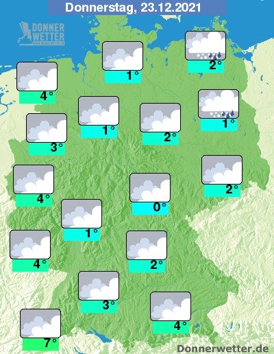 Heute bleibt es weitgehend trüb oder bedeckt, dabei können vor allem im Norden ein paar Flocken oder Tropfen fallen, im Rest des Landes bleibt es jedoch weitgehend trocken. Die Temperatur steigt auf 0 Grad in Jena und bis 7 Grad in Freiburg.