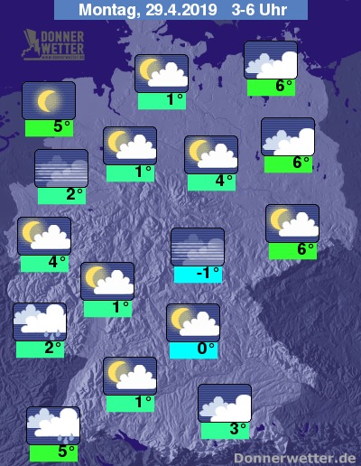 In der Nacht zum Montag fällt im Südwesten unter dichten Wolken weiterhin gebietsweise Regen. Stark bewölkt bleibt es auch über weiten Teilen des Südens, des Nordostens und des Ostens, dazu bleibt es trocken. Im übrigen Land ist es häufig nur locker bewölkt oder sogar sternenklar, dazu bleibt es ebenso trocken. Die Temperatur sinkt auf 6 Grad an der Müritz und bis auf -1 Grad im Eichsfeld.