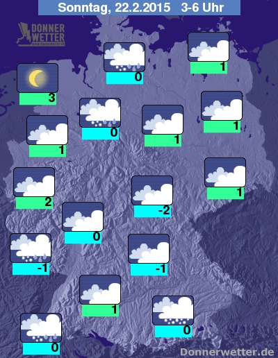 In der Nacht zum Sonntag ist es im Nordwesten des Landes oft sternenklar und trocken, sonst ziehen jedoch weitgehend dichte Wolken übers Land und vor allem im Süden und Westen fällt gebietsweise Schnee, Schneeregen oder Regen. Im Norden können sich einzelne Schnee-, Schneeregen- oder Regenschauer bilden, es besteht stellenweise Glättegefahr. Im übrigen Bundesgebiet bleibt es verbreitet trocken. Die Temperatur sinkt auf 3 Grad an der Nordsee und bis -2 Grad im Coburger Land.