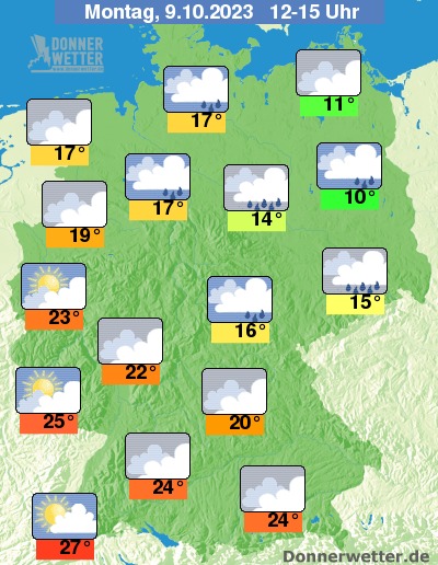 Heute Nachmittag bleibt es über dem Norden und Osten bedeckt und hier fällt auch zeitweise Regen. Im übrigen Land ist es auch meist stark bewölkt oder bedeckt, jedoch weitgehend trocken. Im Südwesten kann sich die Sonne häufiger zeigen. die Temperatur liegt bei 10 Grad an der Oder und 27 Grad am Oberrhein.