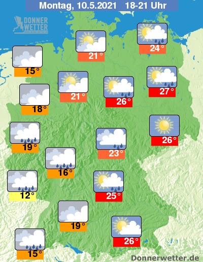 Heute Nachmittag ist es über der Westhälfte des Landes schon meist bedeckt und es fällt gebietsweise Regen, weiter nach Osten hin scheint dagegen auch noch oft die Sonne, wobei auch hier die Wolken immer weiter zunehmen, hier bleibt es noch trocken. Die Temperatur liegt bei 12 Grad an der Nordsee und bis 26 Grad im Berliner Umland.